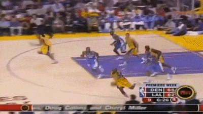 仔細看:這是掘金進攻沒打進,科比后場推進反擊,人群中一個背后運球!