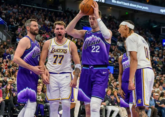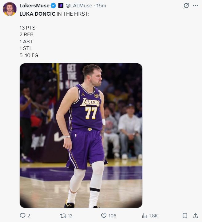 東契奇首節就進入了進攻模式,打滿12分鐘,10中5,三分5中1,拿到13分2籃板1助攻1搶斷,他與里夫斯兩人首節的進攻表現很出色,湖人也壓制爵士。東契奇背運過人2+1后還怒吼超級霸氣。
