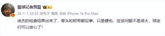 而徐杰表情痛苦無法行走的畫面,令人揪心。賽后,杜鋒表示徐杰已經去拍片檢查去了。隨后,北京籃球記者賈磊在社交平臺給出徐杰傷情,“徐杰的檢查結果出來了,骨頭和韌帶都沒事,只是硬傷,應該問題不是很大,球迷們可以放心了!