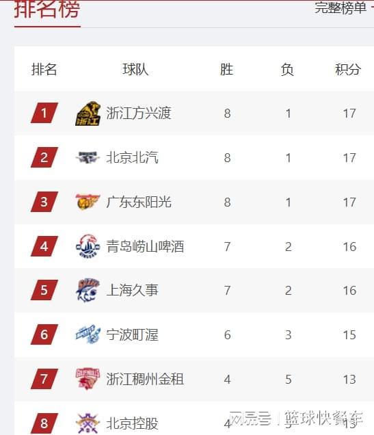 而北京隊這一戰掀翻廣東隊以后,他們的戰績變成了8勝1負,排在積分榜第2名。11冠王廣東隊,他們在輸給北京隊以后,8連勝紀錄被終結,戰績變成8勝1負,排名從積分榜第一下滑到第三。排在積分榜第四名的是青島隊,他們在一度領先浙江隊的情況下被對手逆轉,最終加時遺憾輸掉比賽。球隊目前以7勝2負的戰績,排在積分榜第4名,而積分榜第五的是上海隊,他們的戰績也是7勝2負。