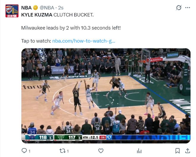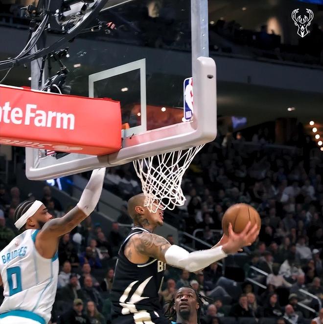庫茲馬命中這個120-108的三分球后雄鹿全隊開始慶祝,球迷們都站起來慶祝。可很快就笑不出來,因為布里奇斯面對庫茲馬完成了空接2+1,黃蜂121-120再度反超黃蜂。