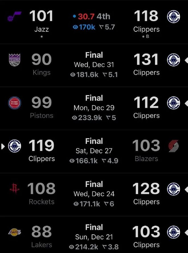 值得一提的是,在祖巴茨受傷的那場(chǎng)比賽以及休戰(zhàn)的五場(chǎng)比賽里,快船全部贏球從而豪取六連勝,因此戰(zhàn)績(jī)從墊底位置飆升至如今的12勝21負(fù)位列西部第11,暫時(shí)落后第十的開(kāi)拓者兩個(gè)勝場(chǎng)。