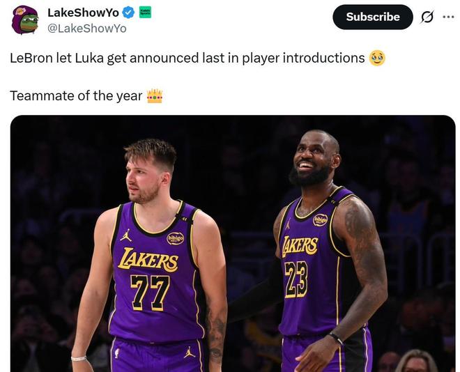 不僅是賽后公開稱贊東契奇是球隊核心,根據美媒LakeShowYo報道,在賽前介紹球員入場時,詹姆斯也讓東契奇最后一個壓軸出場。