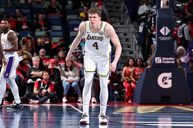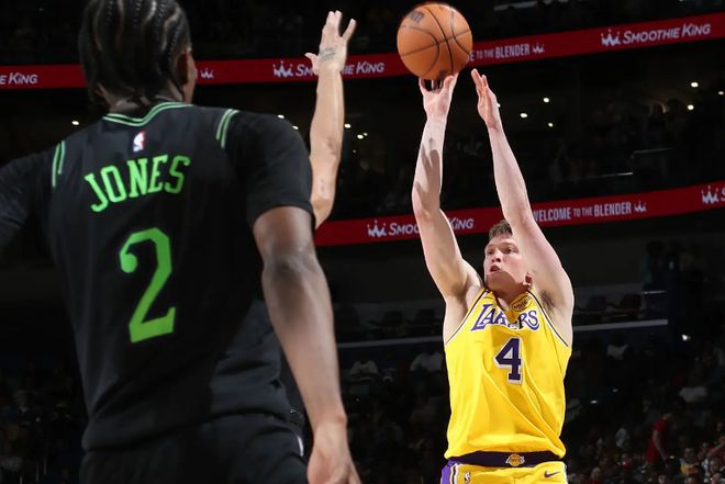 本場(chǎng)比賽中,湖人的替補(bǔ)側(cè)翼新星道爾頓-克內(nèi)克特(Dalton Knecht)非常罕見(jiàn)地在比賽常規(guī)階段起到了一些作用??藘?nèi)克特全場(chǎng)出場(chǎng)10分56秒,投籃5中2,三分線外4中2,得到了6分,還有2次犯規(guī),正負(fù)值為+5。大家都知道,克內(nèi)克特在其他方面的能力非常有限,沒(méi)有基本的傳球視野,沒(méi)有出色的防守能力,在其他方面都實(shí)在是沒(méi)有辦法為球隊(duì)提供任何的幫助和支持,但至少在本場(chǎng)比賽中,他還是命中了兩記三分,在有限的出場(chǎng)時(shí)間內(nèi)在進(jìn)攻端為球隊(duì)提供了一定的幫助和支持??藘?nèi)克特在本場(chǎng)比賽中也算是完成了自己應(yīng)該完成的任務(wù),在場(chǎng)上起到了自己的作用,并且為球隊(duì)的勝利做出了不小的貢獻(xiàn),至少他也是沒(méi)有拖球隊(duì)后腿了。