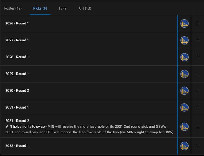勇士手中只有26年、27年、28年、29年、31年、32年的首輪簽,也就是沒有30年,所以目前勇士能交易的首輪簽只有三個,換墨菲要送兩個后,直到2032年只有4個首輪簽,勇士隊會愿意嗎?