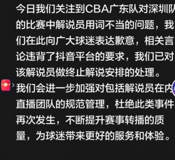 1月8日,目前CBA常規賽正火熱進行中,多場精彩比賽上演。然而這時候卻出現不和諧的一幕,在昨晚廣東隊和深圳隊的比賽中,某音平臺解說的一番言論引起軒然大波,對球迷極盡嘲諷。