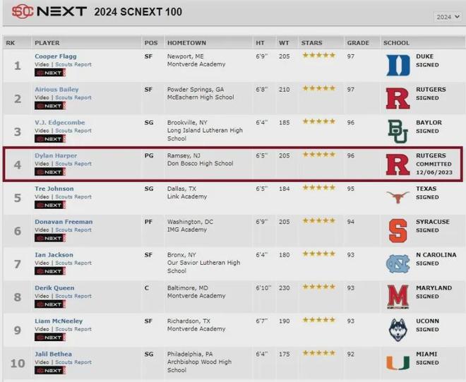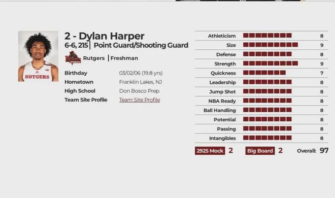 眾多NCAA D1級名校均向他發出招募邀請,但他最終受到哥哥影響,選擇了哥哥曾效力四年的羅格斯大學,該校球隊在NCAA聯盟并不屬于強隊,球隊自1906年建隊以來總計只打進過8次瘋狂三月,而小羅恩-哈珀是這球隊的傳奇,在2021、2022連續兩年帶領球隊打進了瘋狂三月,他和球隊主教練史蒂夫-皮基爾情如父子,在哥哥的積極招募下,弟弟迪倫也加入這所大學,而且還有一個重要原因就是在迪倫之前,羅格斯大學還破天荒的招募到了百大高中生排名第2的艾斯-貝利,這也是校史招募到的排位最高的高中生,后來經媒體披露,羅格斯大學在招募貝利的見面會中明確承諾迪倫一定會加入球隊,兩名全美數一數二的高中生雙劍合璧.