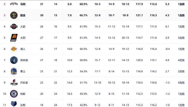 目前,除了馬刺和掘金的位置比較穩,排名第二和第三之外,排名第四到第七的球隊會隨著比賽的戰績變化而不斷變化,火箭在以122-128輸給76人之后,目前和太陽戰績持平,接下來,如果太陽繼續贏球,而火箭輸球的話,那么雙方的排名將會對調,并且相差一個勝場。