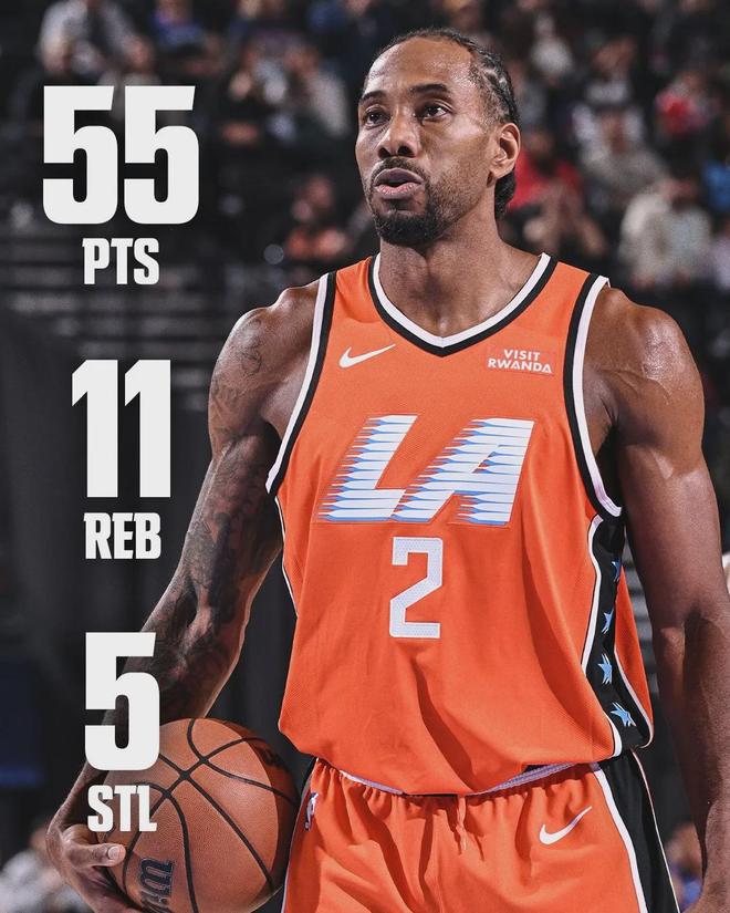 快船開季6勝21負一度西部墊底,隨后16勝3負強勢反彈。快船過去19場比賽,倫納德出戰了其中的16場,場均砍下31.1分6.7籃板3.7助攻2.3搶斷。本賽季至今,倫納德已經連續25場比賽砍下20+,是快船隊史第4位做到的球員!