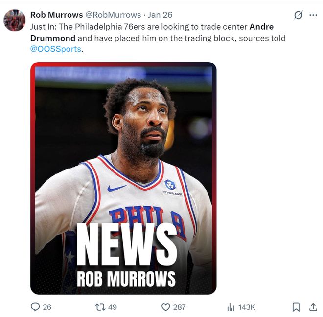 費城76人是在1月26日將德拉蒙德擺上貨架的,他本賽季在費城場均20分鐘,拿到7分8.9籃板0.8助攻0.6搶斷0.9蓋帽,命中率50%,他本賽季在費城打了36場比賽,近期的比賽都是打打停停開始被排除在主力輪換之外,32歲的他年薪僅500萬。