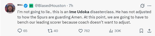 北京時間1月29日,火箭在主場被馬刺逆轉(zhuǎn)16分吞下慘敗,從領(lǐng)先16分到慘敗12分,里外里被馬刺翻過去28分,這場比賽火箭在下半場進攻端先開始崩盤,緊接著防守端的積極性也喪失了,申京20投7中,阿門23投11中,而杜蘭特17投8中,找不到主攻點成為失利要因。