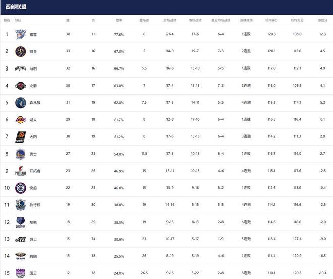 1-3名:雷霆(38勝11負(fù))、掘金(33勝16負(fù))、馬刺(32勝16負(fù))