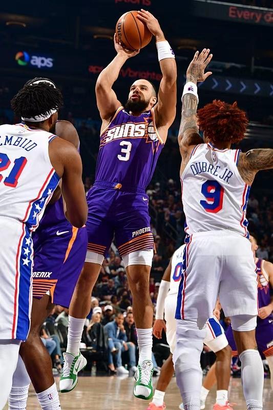 次節(jié)比賽,雙方進(jìn)攻火力均是有所提升,76人完成兩隊(duì)首次單節(jié)得分30+。76人在27-26情況下,馬克西與恩比德連續(xù)得分,引領(lǐng)一波17-2攻勢(shì)碾壓,76人擴(kuò)大44-28領(lǐng)先。太陽回敬一波15-6攻勢(shì)追到差7分,76人很快重新擴(kuò)大兩位數(shù)領(lǐng)先優(yōu)勢(shì),76人單節(jié)34-25凈勝9分,上半場(chǎng)結(jié)束76人擴(kuò)大58-47領(lǐng)先太陽。前兩節(jié)比賽,太陽三分僅25中4,狄龍9中4得到11分與布克7中3得到7分4助攻;76人三分20中7,馬克西14+4+4與恩比德7中4得到17+6。