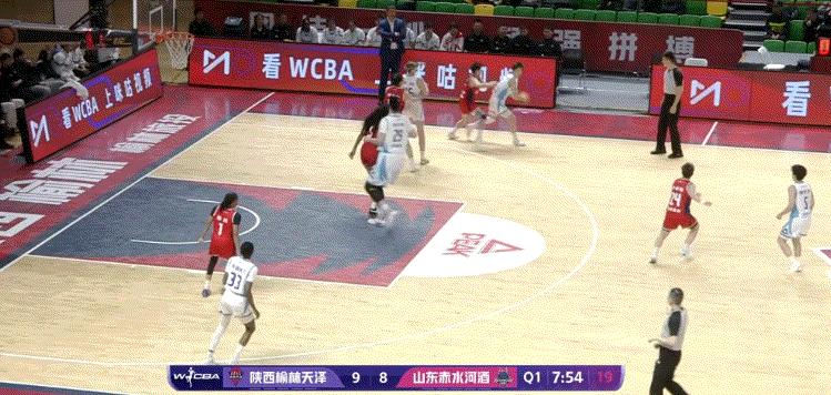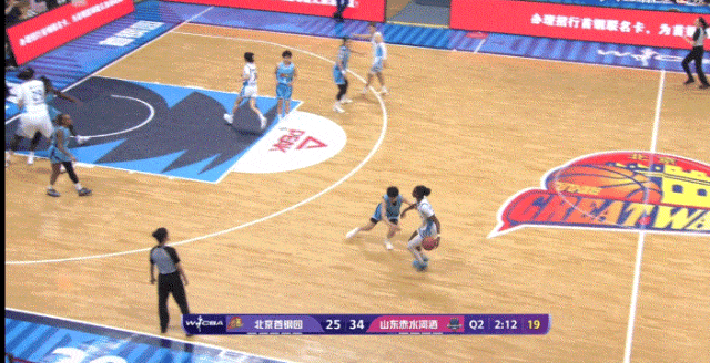 后衛(wèi)溜底線到轉(zhuǎn)移球給強(qiáng)側(cè),然后翟若云移動到弧頂?shù)穆?lián)防空檔