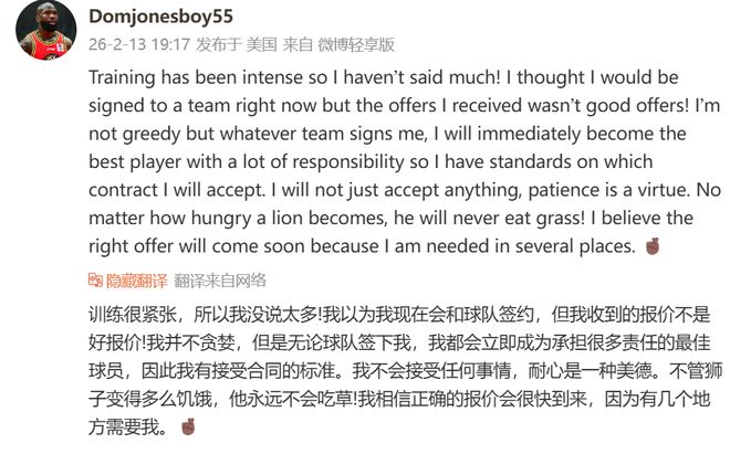 到目前為止,瓊斯都沒有獲得一份合同。其實(shí)在過去一段時間,瓊斯在NBL打球,后續(xù)回到美國養(yǎng)傷。無奈這波養(yǎng)傷之后,瓊斯并沒有回歸到CBA。根據(jù)他曝光的動態(tài)來看:我以為我現(xiàn)在會和球隊(duì)簽約,但我收到的報(bào)價不是好報(bào)價!這樣的話語已經(jīng)非常明顯了,他之所以沒有回到CBA,就是因?yàn)樾劫Y沒有到位,所以他始終都沒有談妥。