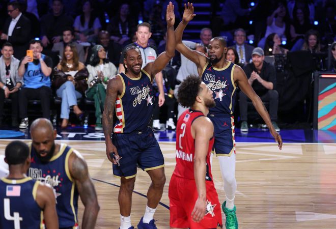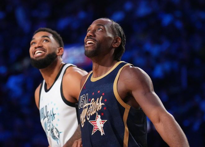 小試牛刀!面對世界隊,對位的是本屆全明星最努力的另外一位球星:文班亞馬,結果倫納德打滿12分鐘,13中11,爆砍31分3籃板2搶斷!場邊的庫里和老詹都成小迷弟,當倫納德無解三分再中后,起立揮手非常興奮。文班亞馬自己都說:我從一開始就防守倫納德了,確實拼盡全力去防了!而決賽打美國新星隊,倫納德又打滿了12分鐘,4中0,拿到1分1籃板1助攻。你們多久沒在全明星舞臺上,看到過三人包夾圍堵一名全明星遞補了?倫納德做到了,為了限制倫納德得分,對手三人包夾車輪戰!于是倫納德數據,最終定格在34分鐘轟下37分。