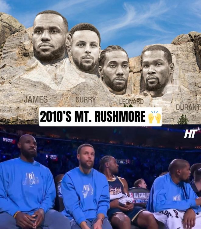 凱文-杜蘭特在全明星周末唯一的正面報道,可能就是這張圖,被譽為是21世紀的‘總統山’,詹姆斯、庫里、倫納德、杜蘭特,這四人12次總冠軍,7次MVP,9次FMVP。