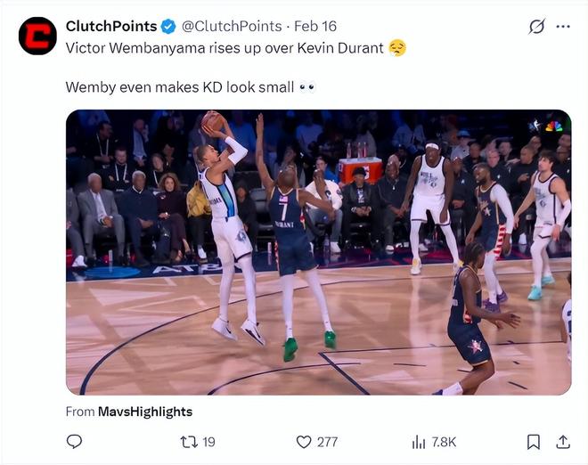 在全明星正賽中,杜蘭特防守文班亞馬時,文班亞馬面對KD干拔后仰中投命中,美媒Clutchpoints寫道:跟文班亞馬比起來KD看起來都小一圈。