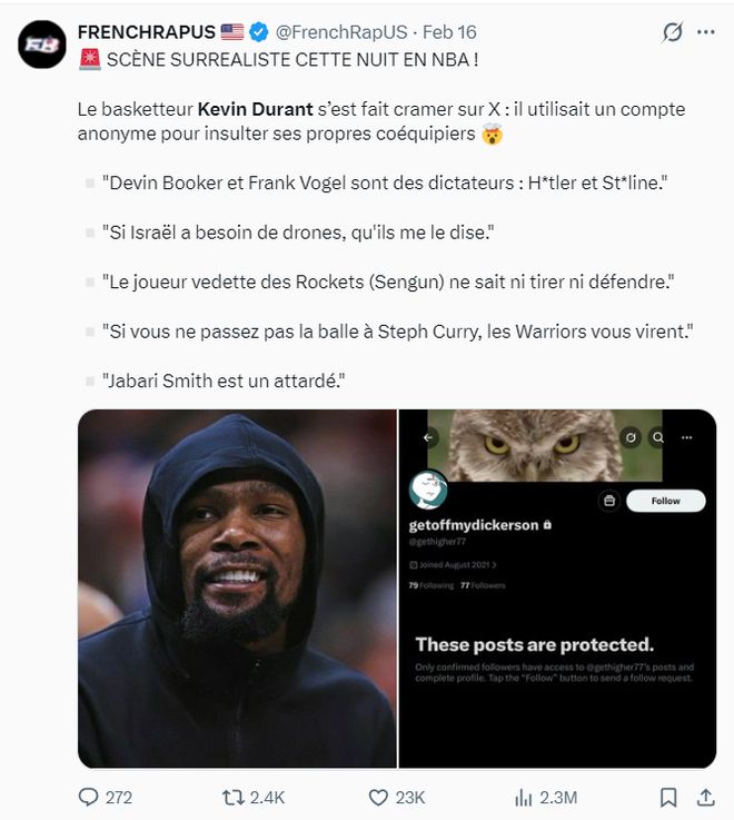 除此之外,杜蘭特在全明星周末期間還被曝出了‘疑似小號’的事件,杜蘭特對德文-布克、小賈巴里-史密斯、阿爾佩倫-申京、庫里、科爾等人的批判性言論引發了全世界的議論,目前杜蘭特本人還沒有出面澄清。
