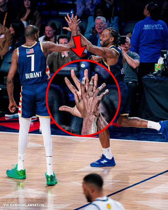 在倫納德的個人IG上有一張圖,杜蘭特與倫納德擊掌,隨后這張圖引起了全美媒體的熱議,因為杜蘭特的手掌比倫納德小了一大圈。