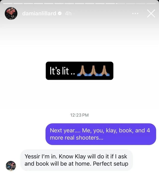目前這件事已經得到了利拉德確認,利拉德在個人社交媒體上曬出了他與庫里的聊天記錄,具體如下: