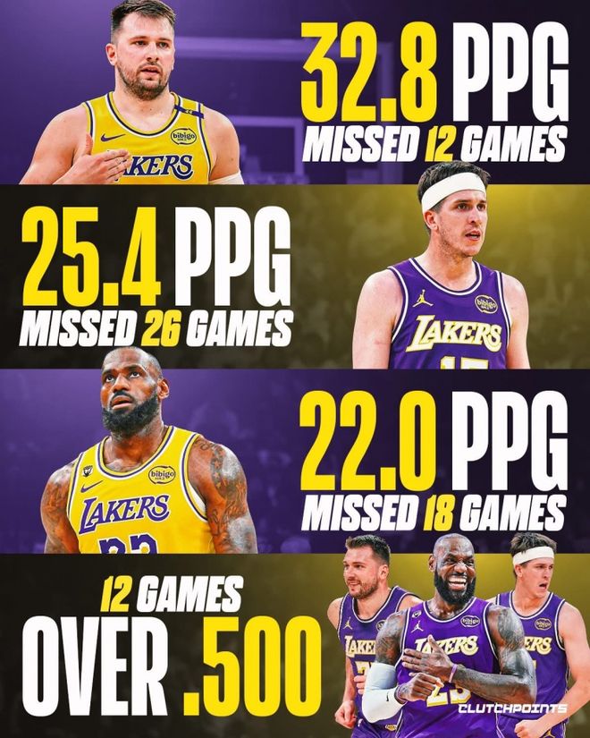 不過有媒體ClutchPoints認為湖人在三大持球核心輪流長時間缺席的情況還能在全明星賽前排名西部第五,未來可期。東契奇缺席,湖人6勝6負。詹姆斯缺席,湖人11勝7負。里夫斯缺席湖人14勝12負。很少有球隊在50多場比賽、隊內前三球員同時打才10場的情況下,勝率還超過六成。湖人雖然不至于爭冠,也沒進相關機構的奪冠概率榜前十,但也能在季后賽翻江倒海。特別是如果季后賽全員健康的話,湖人最終奪冠的可能性不大嗎?