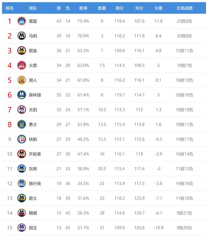 雷霆贏球后43勝14負,排名西部第一。