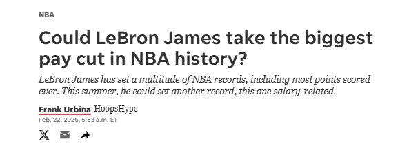 當(dāng)然,這一切討論也可能最終落空。據(jù)報道,湖人愿意續(xù)約詹姆斯,并且擁有他的伯德條款,可以為他開出2026-27賽季的頂薪——5810萬美元。不過從目前情況看,湖人以這個價位續(xù)約的可能性并不大。