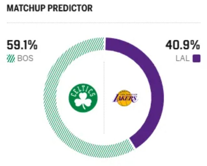 賽前,美媒ESPN對本場比賽進行了勝率預測,湖人隊勝率僅有40.9%, 凱爾特人勝率則高達59.1% ,差距還是很明顯的。