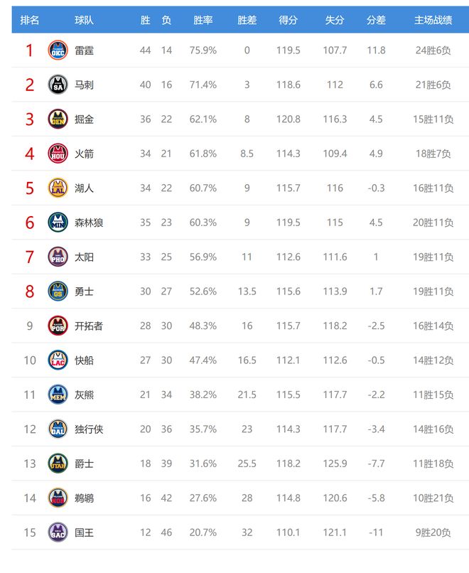 雷霆贏球后2連勝,戰績44勝14負,排名西部第一,領先第二的馬刺3個勝場。