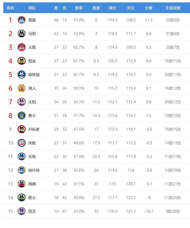 今日比賽后鵜鶘、爵士排名互換,其他西部球隊(duì)排名不變。