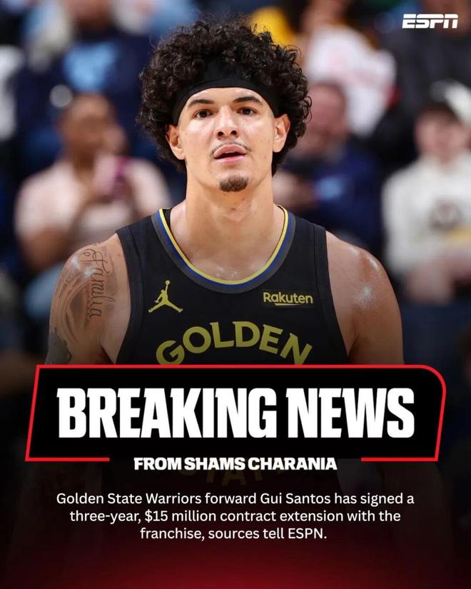 來自昨天深夜名記Shams的消息,勇士前鋒吉桑托斯已經與球隊簽下一份3年1500萬的續約合同,該合同還包含了2028-29賽季的球員選項。