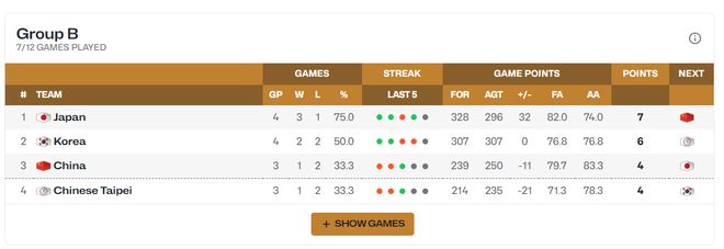 當下中國男籃、中國臺北男籃都是1勝2負積分4分,中國隊-11第三,中國臺北隊-21第四。(日本3勝1負第一、韓國2勝1負第二)規則是小組前三晉級第二階段,第四被淘汰,所以中國隊能擊敗日本非常重要。