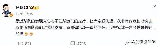 楊鳴當時更新社媒發文表示:最近球隊的表現真心對不住球迷們的支持,讓大家很失望,我非常內疚和慚愧,感謝所有隊員們對我的支持,感謝俱樂部一直的信任。遼寧籃球一定會越來越好。