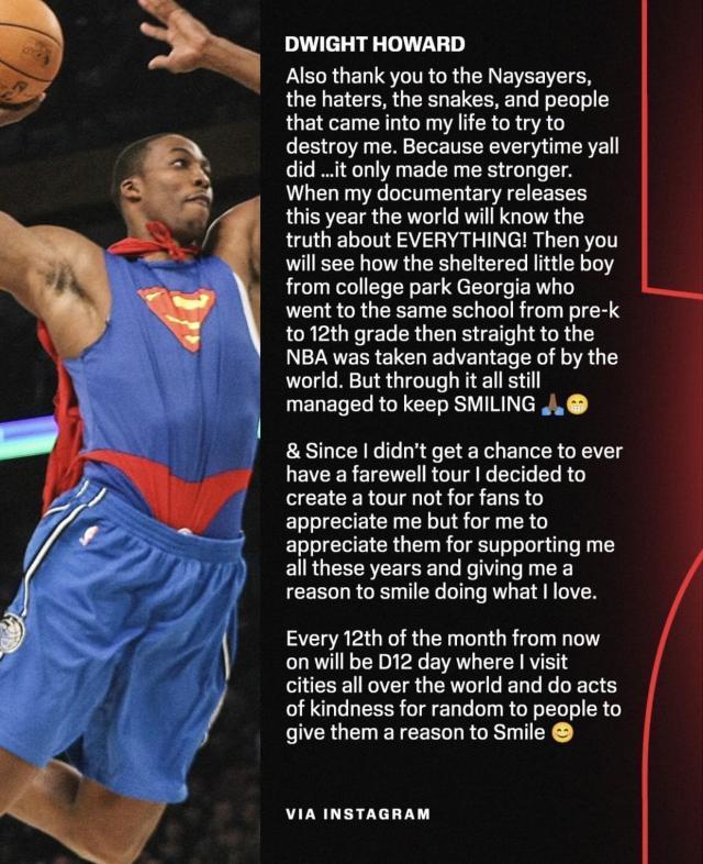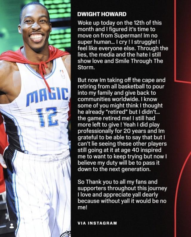 3月13日,40歲的前NBA球星德懷特·霍華德在社媒發(fā)表長文宣布正式退役。霍華德生涯曾先后效力于魔術(shù)、湖人、火箭、老鷹、黃蜂、奇才、湖人、76人、湖人和中國臺灣聯(lián)賽云豹。