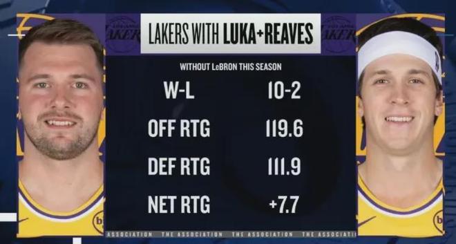 數據顯示,本賽季至今當詹姆斯缺席而東契奇+里夫斯同時出戰時,湖人表現如下: