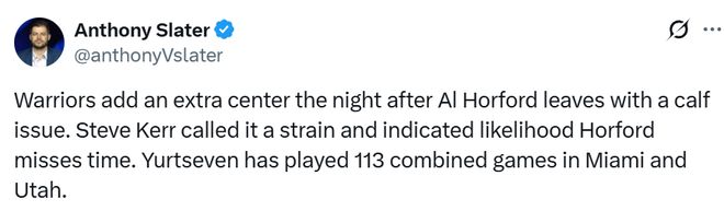 老將中鋒霍福德因右小腿受傷,預計將缺席多場比賽。據勇士隊記Slater透露,39歲的霍福德被確診為比目魚肌(小腿)拉傷,塞斯-庫里則是左內收肌拉傷。除波斯特出戰成疑外,上述所有球員都將缺席周一對陣尼克斯的比賽。