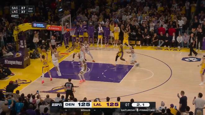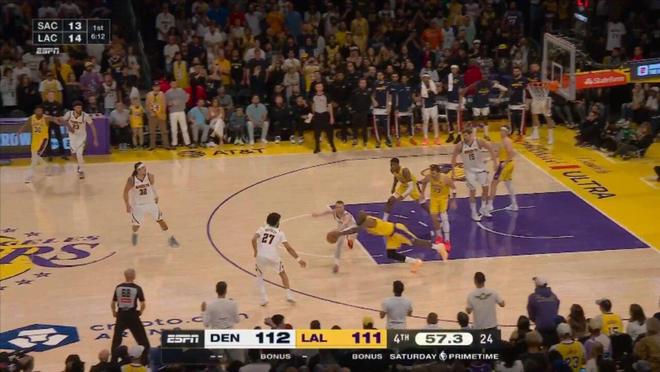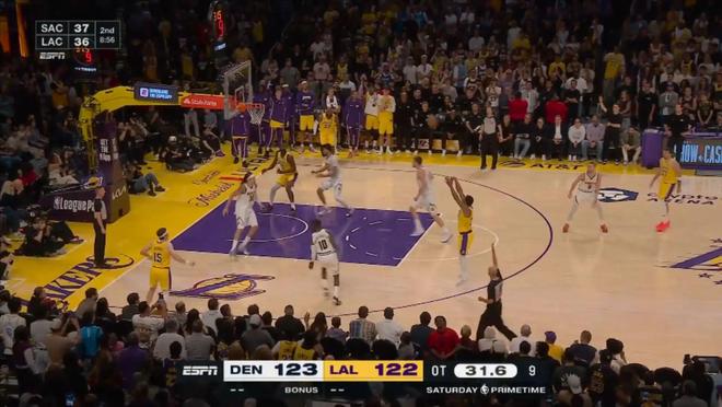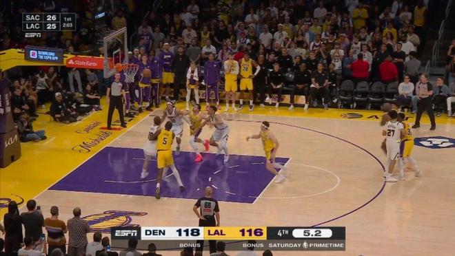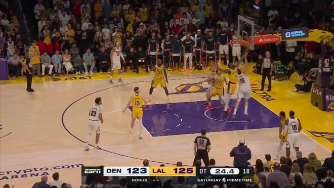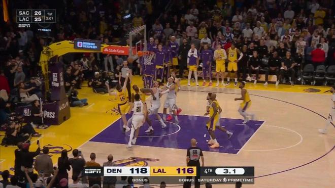 當時剩下9秒前,掘金領先3分,然后采用點球戰術,里夫斯第一次上罰球線,前兩罰全中,第二次再上罰球線,依然是落后3分,時間只剩下5.2秒,湖人沒有暫停。