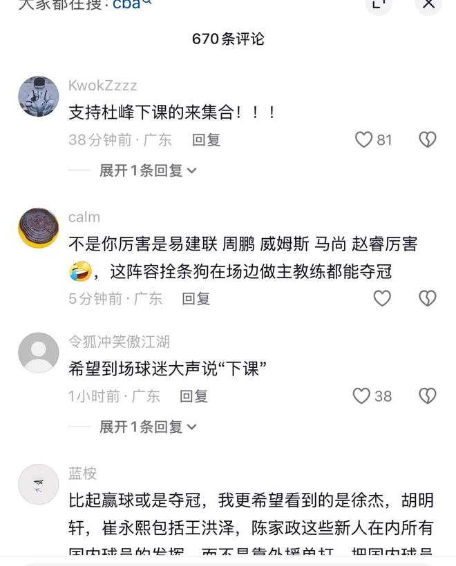 本場比賽杜鋒再度讓球迷感到絕望。賽前宏遠官宣崔永熙復出,本賽季首次全員出戰,結果上來球隊就被打了一個26-11。杜鋒在用人上、戰術上、指揮上都徹底被遼籃的烏戈壓制,加上歷年來杜鋒的各種離譜操作,廣東球迷對杜鋒的不滿終于達到了頂點。賽后杜鋒的社交媒體評論區一片“下課”呼聲。有球迷建議杜鋒和朱芳雨一起去找李春江釣魚,有球迷建議杜鋒學一下楊鳴,“給球迷一條活路,給自己一個體面”。也有球迷覺得杜鋒最好是專心從政,球隊還是交給合適的人接手好了。無論如何,杜鋒的宏遠教練生涯都到了最危險的地步,不知道陳老板還能忍他到什么時候。