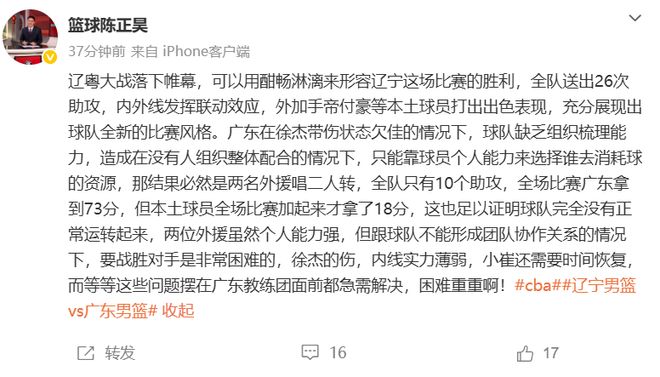 上海的媒體人陳正昊則認為徐杰的問題很大:遼寧全隊送出26次助攻,內(nèi)外線發(fā)揮聯(lián)動效應(yīng),外加手帝付豪等本土球員打出出色表現(xiàn),充分展現(xiàn)出球隊全新的比賽風格。