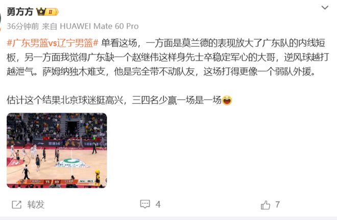 北京媒體人勇方方認為廣東缺少了莫蘭德和趙繼偉這樣的內(nèi)外線核心:單看這場,一方面是莫蘭德的表現(xiàn)放大了廣東隊的內(nèi)線短板,另一方面我覺得廣東缺一個趙繼偉這樣身先士卒穩(wěn)定軍心的大哥,逆風球越打越泄氣。薩姆納獨木難支,他是完全帶不動隊友,這場打得更像一個弱隊外援。