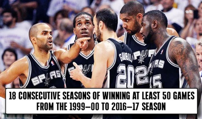 放大到馬刺隊史,從1968年建隊到2019年,超過50年時間,馬刺一共只有六個賽季勝場不足35勝,恰好與過去六年相同(當然過去六年包含了兩個縮水賽季)。