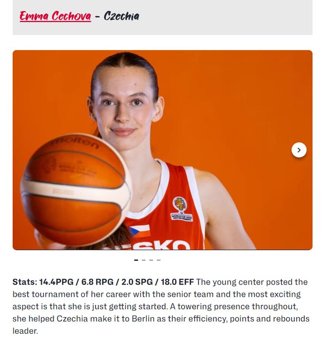 女籃世界杯16支正賽球隊已經產生,武漢賽區的最佳陣容也出爐:阿萊曼德(比利時)、梅斯曼(比利時)、楊舒予(中國)、海拉達(馬里)、切霍娃(捷克)。這套最佳陣容出爐后引發了一些爭議,因為捷克隊的中鋒切霍娃效率遠不及張子宇。