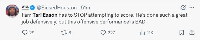 休媒:伊森應該停止個人進攻,他就該專注防守,他在進攻端的表現實在是太糟糕。