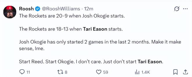 火箭記者Bradeaux:求求烏度卡,讓塔里-伊科回替補席去吧。