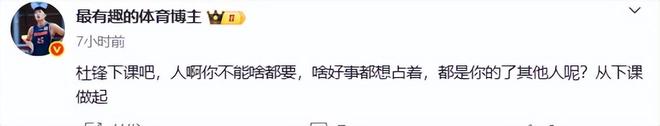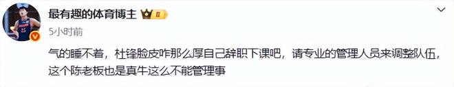 賽后杜鋒繼續甩鍋,批隊員沒有防守,沒有能量,一味的在外線投籃。可是杜鋒就是一個笑話,這防守不是你杜鋒教出來的嗎?進攻不也是你杜鋒教出來的嗎?你不是非常會打炮轟戰術嗎?球隊沒內線,多在外線出手不正是符合你的戰術打法嗎?球員有何錯?錯的就是你這個貪得不厭的教練。