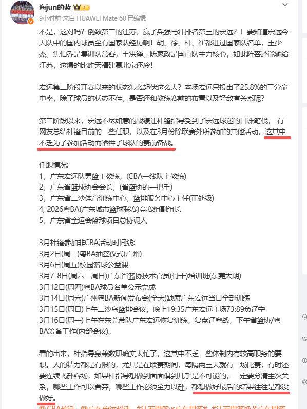 賽后媒體人怒批杜鋒身兼數職,頻繁參加活動犧牲球隊備戰。杜鋒目前擔任了五個職務:廣東宏遠隊男籃主教練;廣東省籃球協會會長;廣東省二沙體育訓練中心,籃排服務中心主任(正處級);2026粵BA(廣東城市籃球聯賽)競賽組副組長;廣東省全運會籃球項目總協調人。