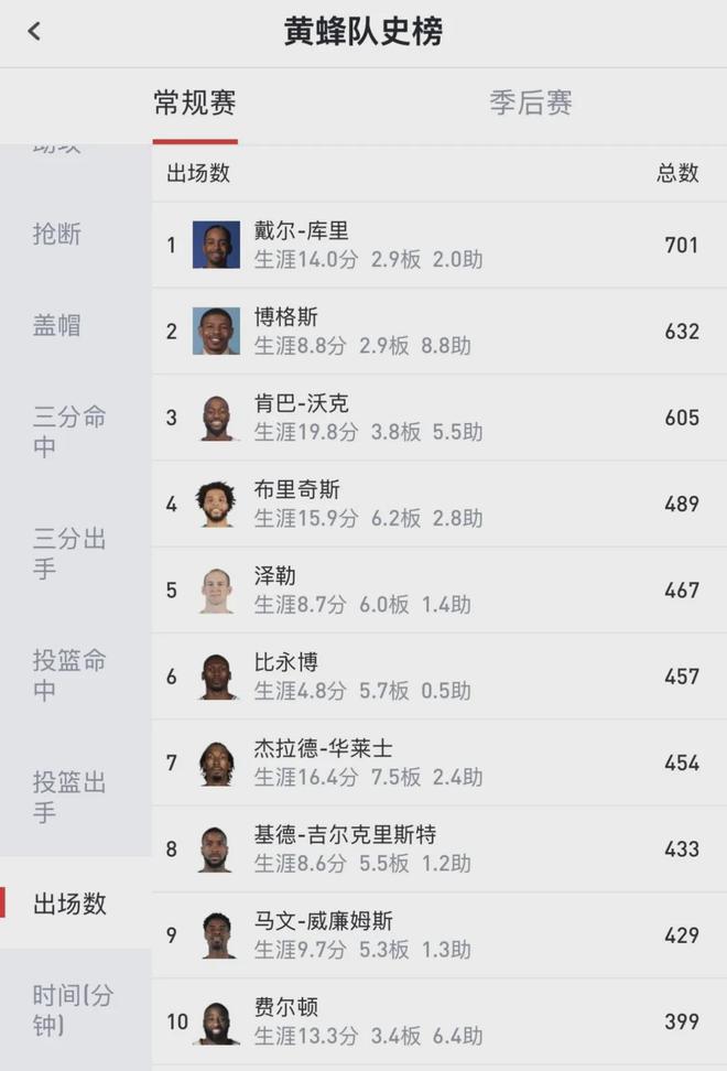 我們搞清楚了球隊(duì)歷史,再來(lái)聊聊戴爾-庫(kù)里。他在黃蜂時(shí)期的總得分(9839)排名隊(duì)史第二,僅次于肯巴-沃克(12009)。戴爾-庫(kù)里的三分命中數(shù)(929)和投籃命中數(shù)(3951),同樣排名隊(duì)史第二。出場(chǎng)數(shù)701,黃蜂隊(duì)史第一。