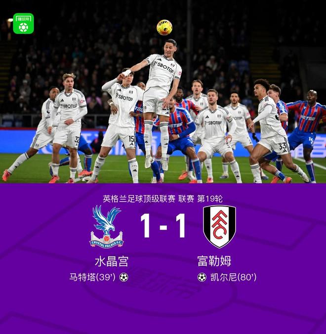 北京時間1月2日,英格蘭足球超級聯賽第19輪,水晶宮坐鎮主場迎戰富勒姆。比賽中,克萊因送出精準助攻,馬特塔抓住機會率先破門,為水晶宮取得領先。下半場,薩薩-盧基奇成功策動進攻,凱爾尼完成破門,幫助富勒姆扳平比分。最終雙方以1比1握手言和。
