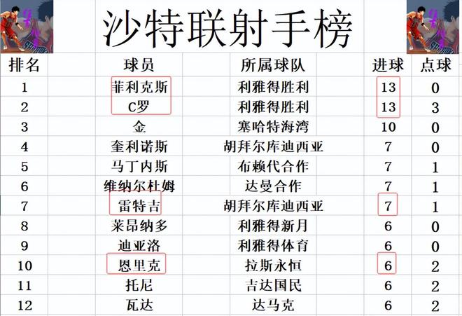 射手榜方面,利雅得勝利的葡萄牙雙槍繼續領跑,C羅,菲利克斯13球并列榜首。金10球排在第2,雷特吉追上維納爾杜姆,馬丁內斯,7球并列第4。恩里克點射打入一球,追上萊昂納多,托尼,6球剛好擠入前十。